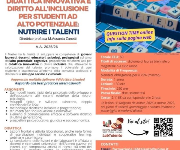 L’Università degli Studi di Pavia attiva per l’a.a. 2026/27 la quarta edizione del master Universitario di primo livello in “Didattica innovativa e diritto all’inclusione per studenti ad alto potenziale: nutrire i talenti” presso il DIPARTIMENTO DI SCIENZE DEL SISTEMA NERVOSO E DEL COMPORTAMENTO. Il Master sarà organizzato congiuntamente con il DIPARTIMENTO DI GIURISPRUDENZA, ECONOMIA E […]