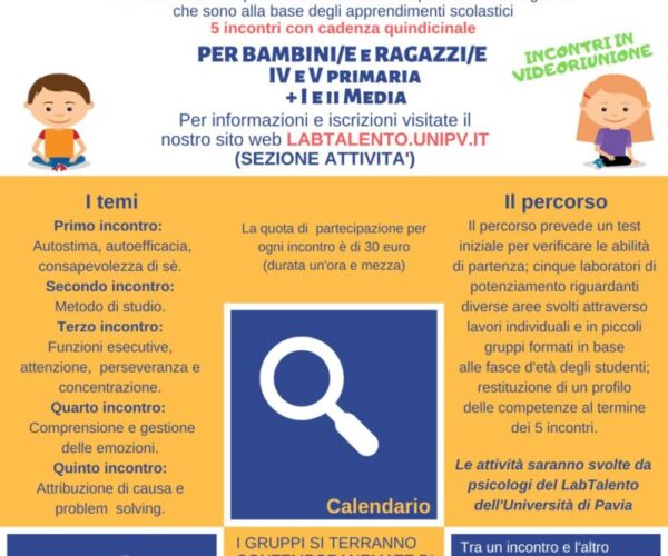 Percorso mirato al potenziamento del metodo di studio con un approccio metacognitivo per favorire gli apprendimenti scolastici Da tempo la proposta dei Laboratori Metacognitivi (giunti ormai alla 10° edizione) si è ampliata con un percorso dedicato alle scuole superiori (classi prime e seconde) ovvero con i Laboratori Metacognitivi Senior: 10 incontri in modalità online, dal 9 febbraio al 20 […]