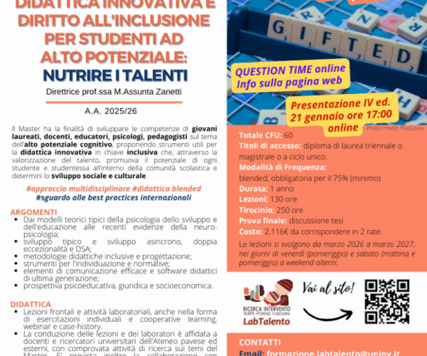 L’Università degli Studi di Pavia attiva per l’a.a. 2026/27 la quarta edizione del master Universitario di primo livello in “Didattica innovativa e diritto all’inclusione per studenti ad alto potenziale: nutrire i talenti” presso il DIPARTIMENTO DI SCIENZE DEL SISTEMA NERVOSO E DEL COMPORTAMENTO. Il Master sarà organizzato congiuntamente con il DIPARTIMENTO DI GIURISPRUDENZA, ECONOMIA E […]